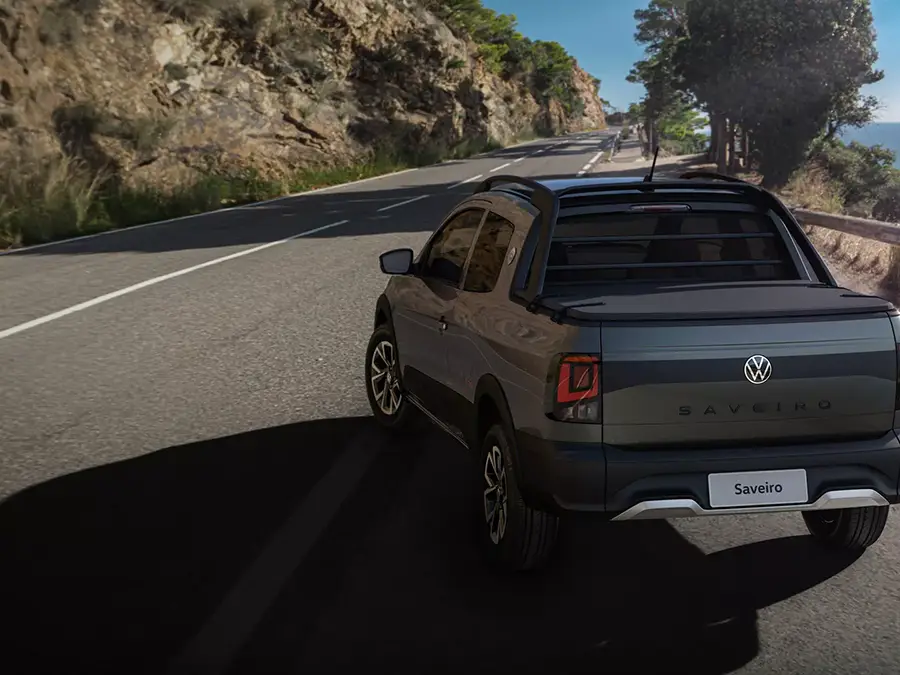 A tampa da caçamba conecta as novas lanternas com design escurecido na traseira, além da faixa em preto fosco horizontal que recorta a traseira e o escrito Saveiro escurecido (exclusivo para as versões Trendline e Extreme).