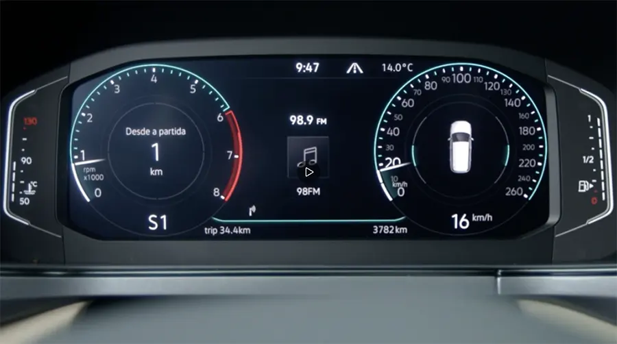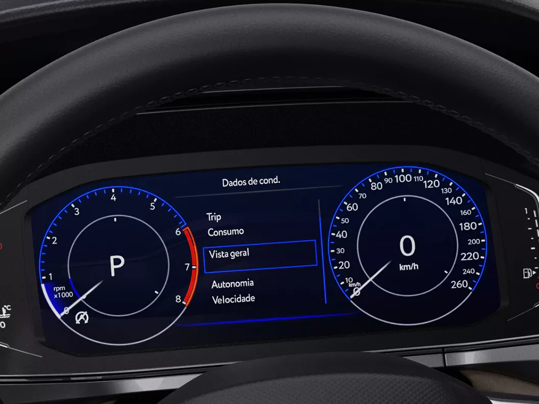 Entretenimento, navegação e dados do veículo, como você quiser O painel digital de 10” permite personalização de acordo com seu perfil. Escolha as telas que deseja visualizar, como o computador de bordo, dados do veículo ou a música que está tocando no seu VW Play.