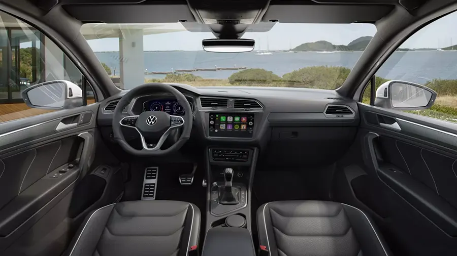 Ao abrir e entrar no Novo Tiguan Allspace R-Line, seu mundo estará mais completo. O novo volante vem com acionamento em touch. O banco do motorista é com ajuste elétrico, com três posições de memória e o banco do passageiro com ajuste de altura. As portas estão com novo acabamento em couro sintético.